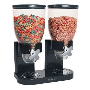 The patented Zevro cereal dispenser prevents cereal or other dry foods from going stale. Kids will find it fun turning the knob and watching the cereal fall perfectly into their bowl while moms can be assured that kids will not be spilling cereal all over the kitchen. Best of all, the dispenser is hermetically sealed which preserves the freshness of dry food. Simply place a bowl under the dispenser and twist a knob to get a controlled portion. The simple, elegant design features two clear, see through, high quality plastic container's which hold one cereal box each. Very easy to clean and fit on most countertops.